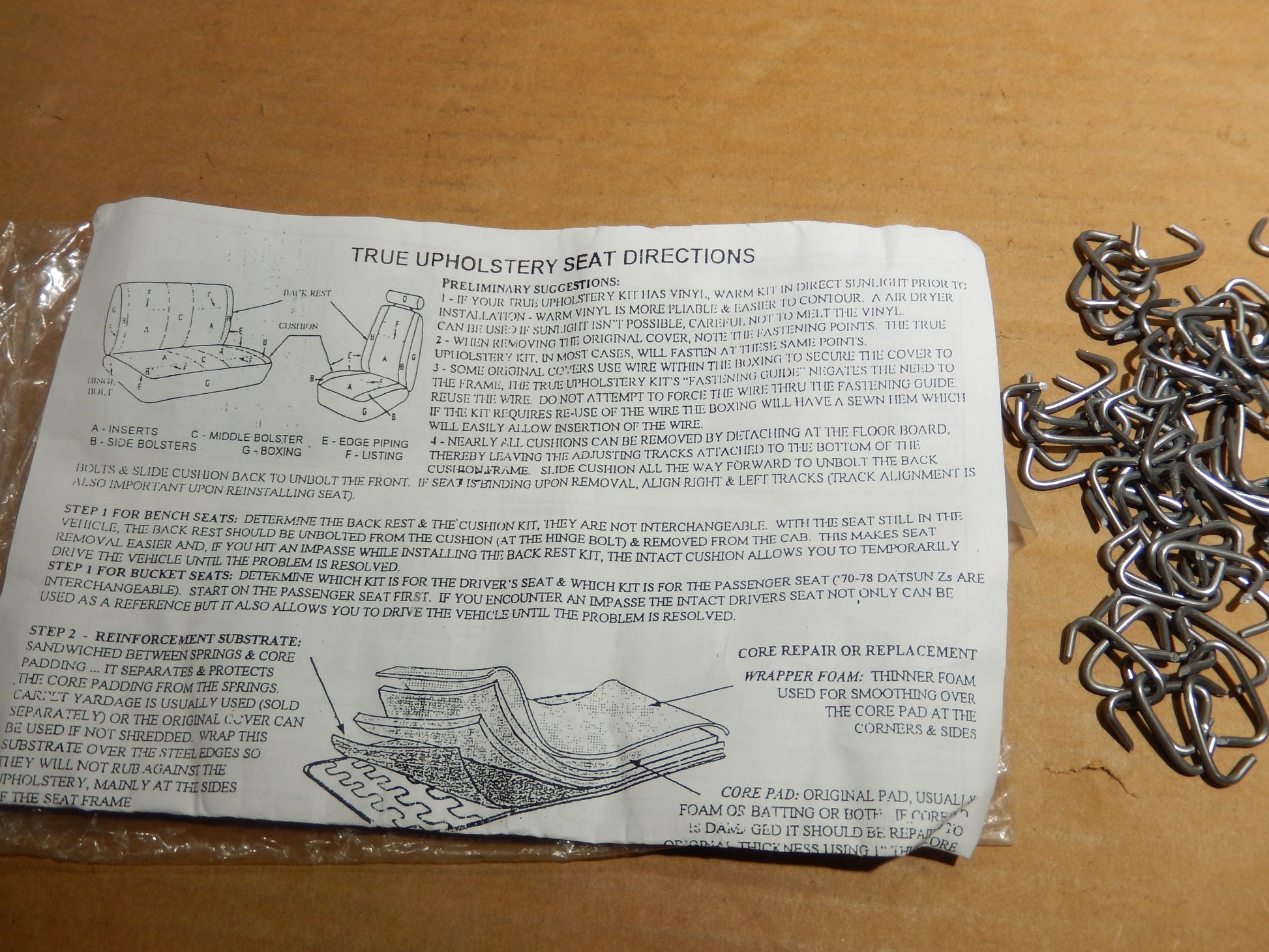 Brand New Datsun 240Z Seat Cover with Instruction Manual and Kit in Absolutely Perfect Brand New Condition from SEAT Z MFG. Two Part, Top and Bottom Pieces. Out of a Collection from the South West. This is the Correct Black Vinyl Fabric. Extremely durable. Guaranteed. SKU 735.