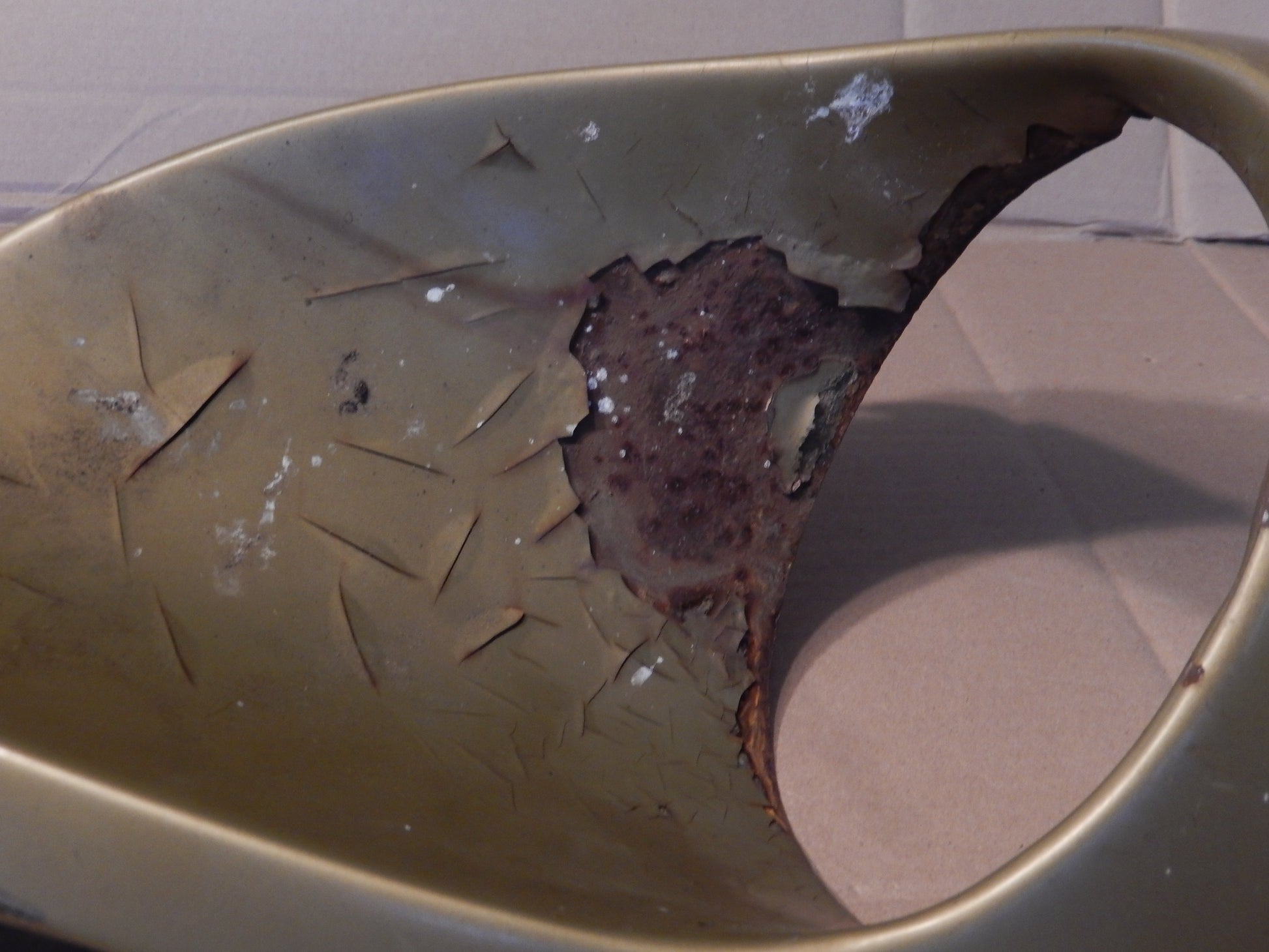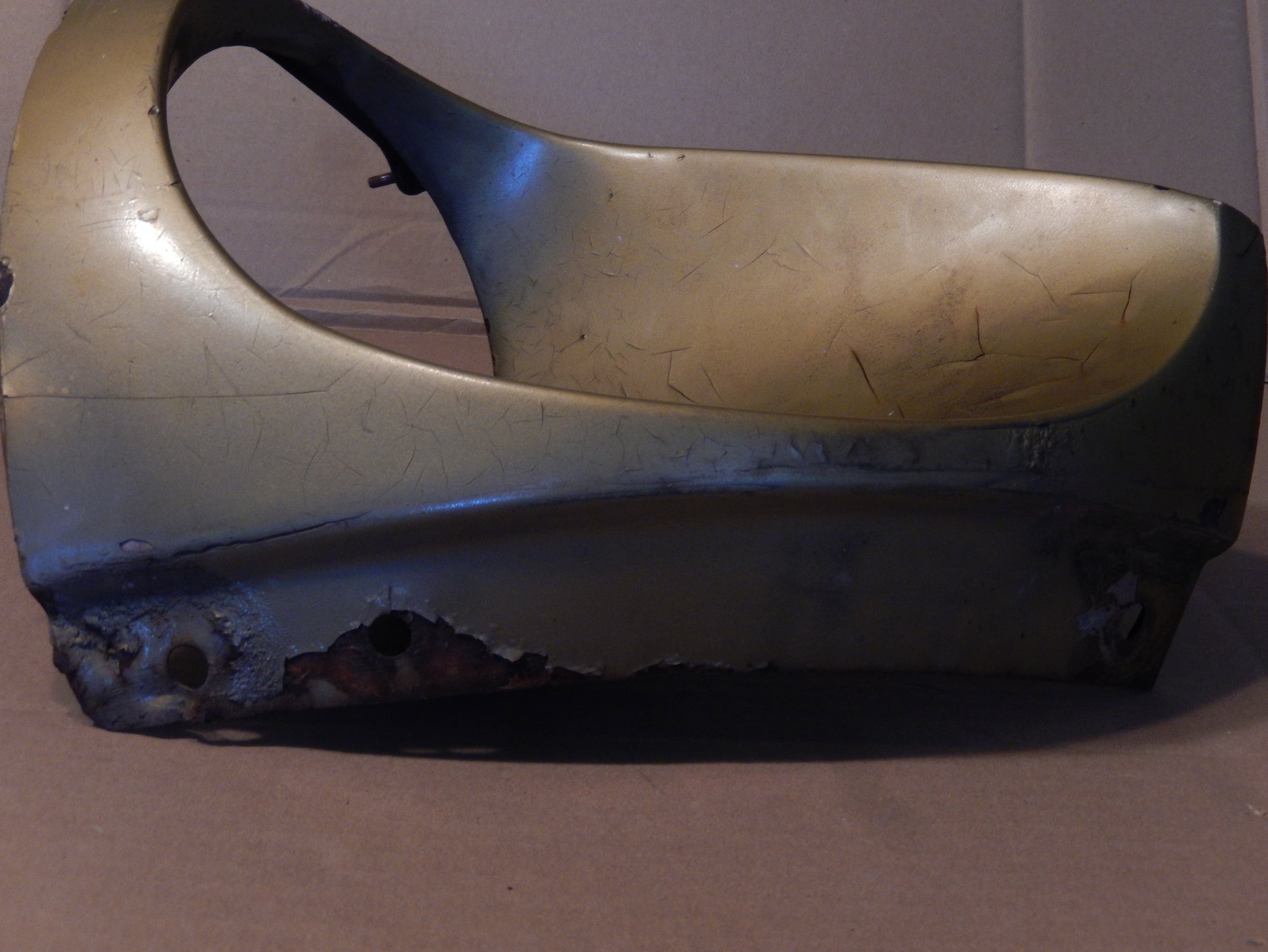 Datsun 240Z Front Passenger Side Head Cowl/Bucket in Gold Color - Paint is Cracking. Very Solid All Over. Heavy Surface Rust - lower inside barrel, lower inside flare - but NOT THROUGH RUST. Solid. Studs Intact. Guaranteed.
