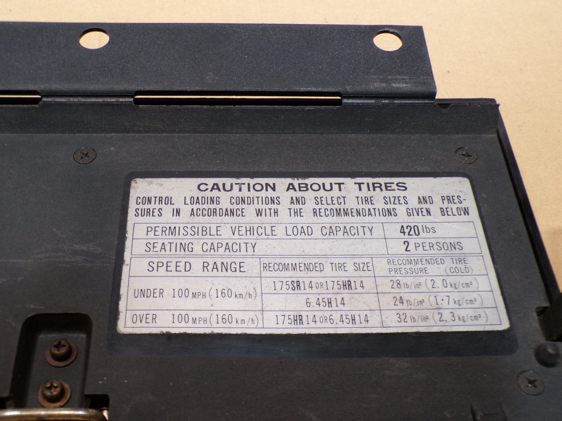 Datsun 240Z Glove Box Lid is a Complete Assembly in Perfect Used Condition Overall. Hinge is Perfect. Brilliant Tire Specification Label and Rare UH / FH / Engine /Door Number Label. Lid Face is Very Nice with Minor Imperfections. Face Script is Bright and Clean. A Complete and Fine Glove Box Lid. Guaranteed.