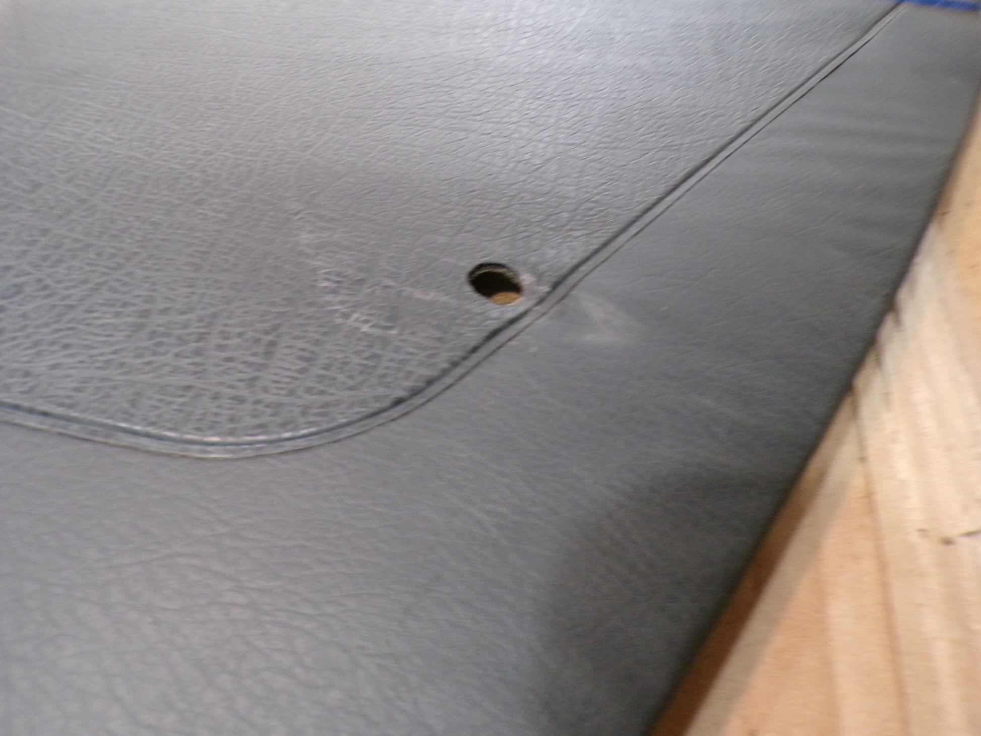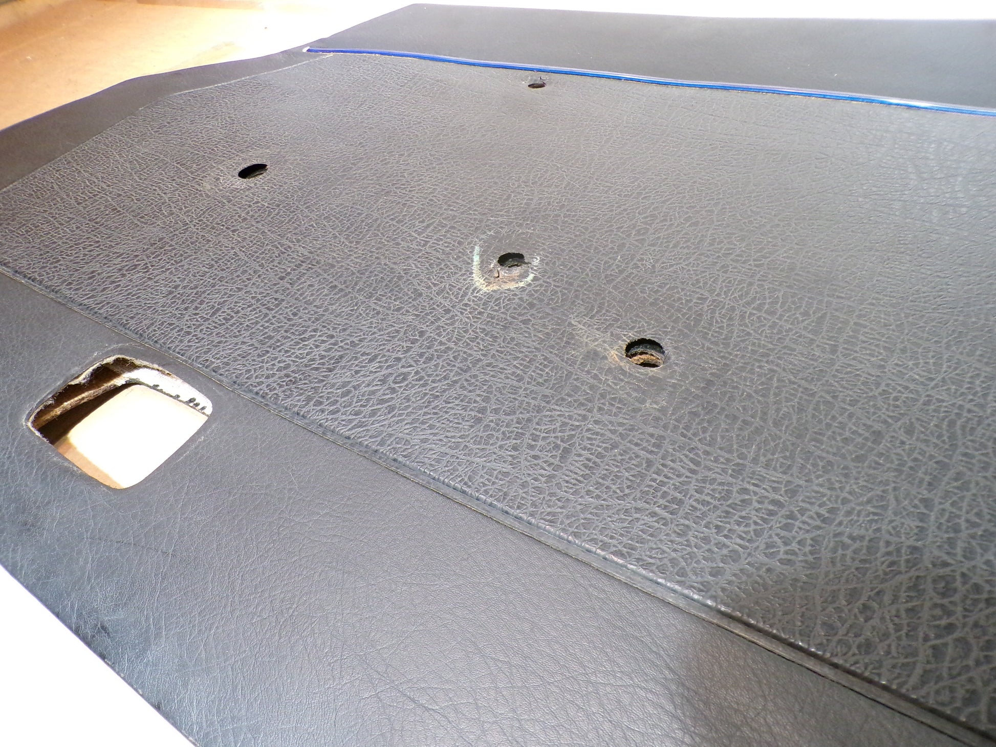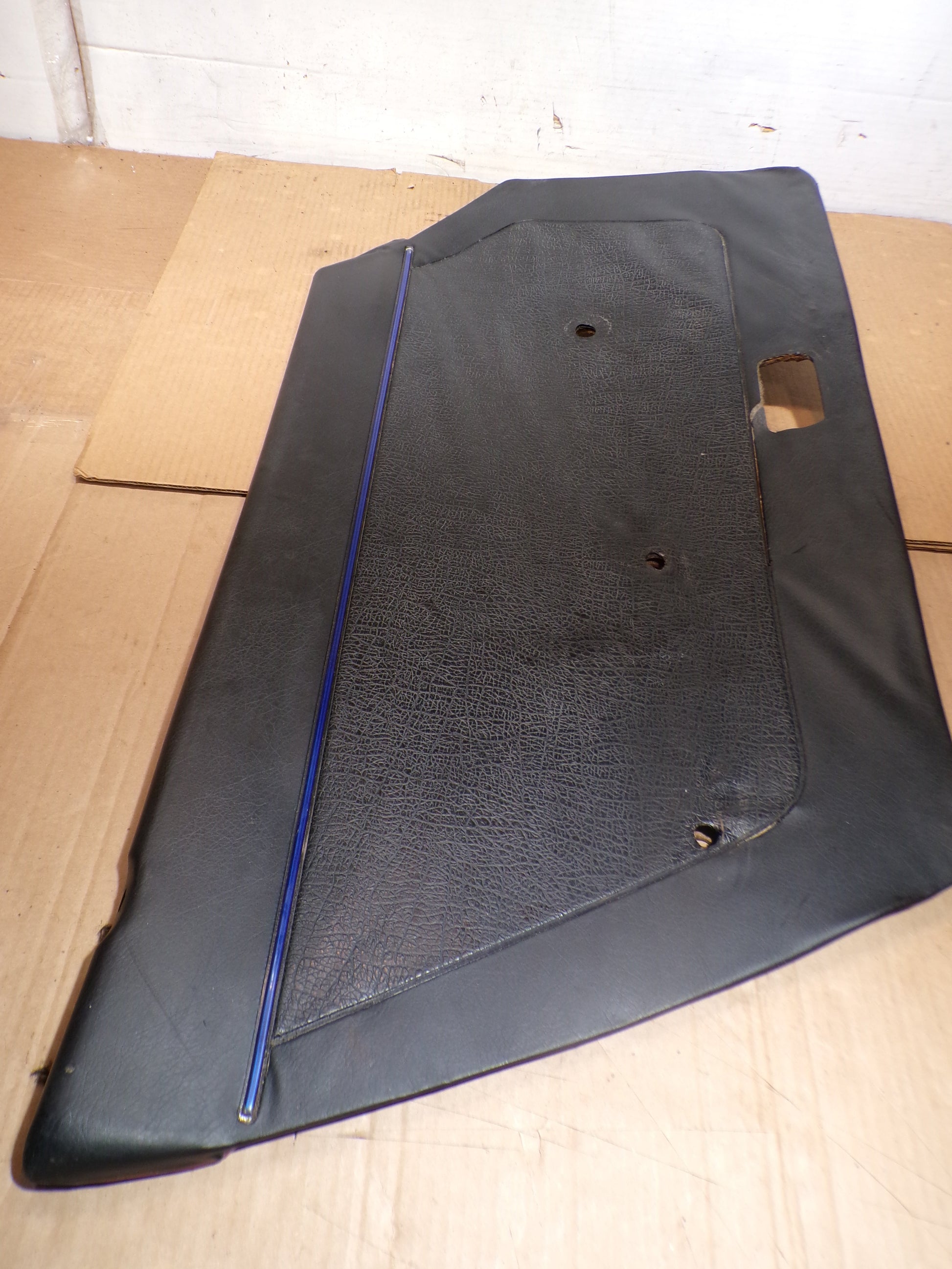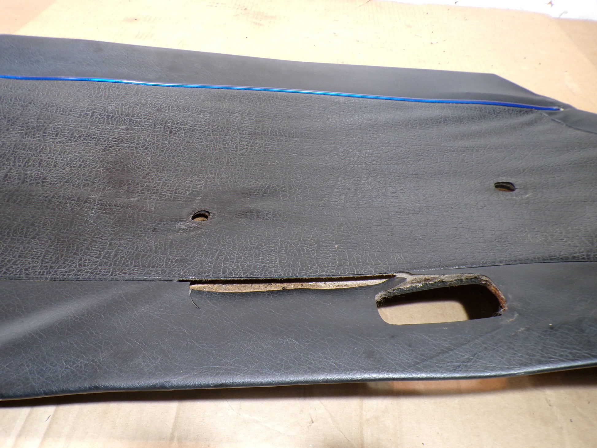 Passenger's Door Panel: Excellent Used Condition. Extremely minor problems only; surface needs cleaning/reconditioning; absolutely, fully intact. No splits, no cuts, no tears. Loop handle mount areas have some extremely minor roughness. The door card is solid and has excellent form. Two of the door card panel clip holes are a little rough. Silver tape is off the chrome highlighter strip. This is a very rare panel, in exceptional condition.
