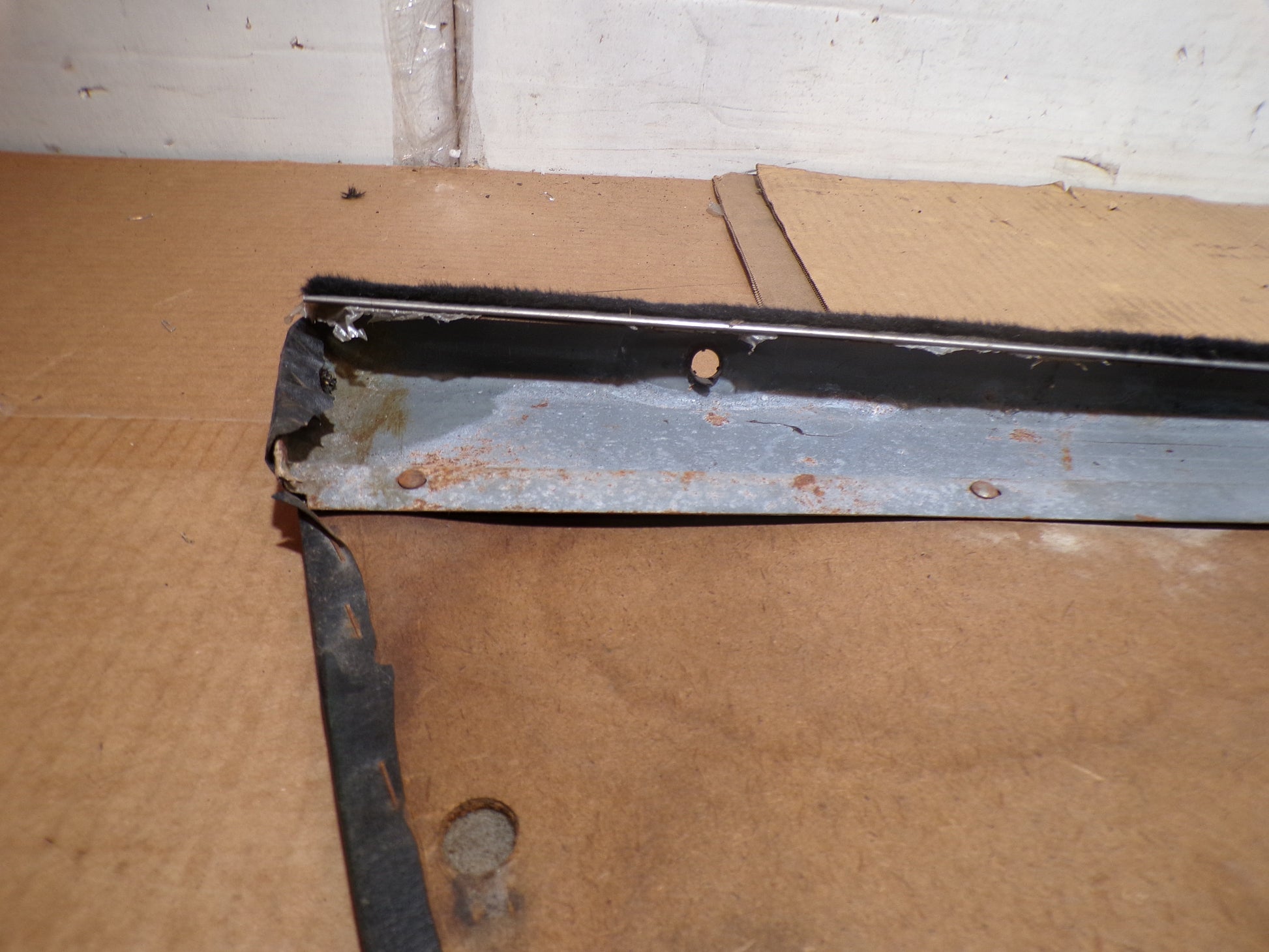 Driver's Door Panel: Slightly rough, but restorable condition. All of the inside door panel liner is there. There is some separation from the central panel and the lower surround in two places at the bottom; the bottom surround has two small splits. Otherwise, the interior panel liner is in excellent condition and very easily restored to original appearance. The chrome trim strip is missing the silver tape. On the back of the Driver's Door Panel, the cardboard is solid, although a little bit warped towards the bottom. Bottom leading front edge of cardboard is a little rough with some material loss and damage to the clip hole. One other clip hole at the base of the cardboard is rough. Minor area of door latch port has a tiny rough area. Inside window scraper brush will need replacing. All of this is easily restored, otherwise, the panel is in good shape.