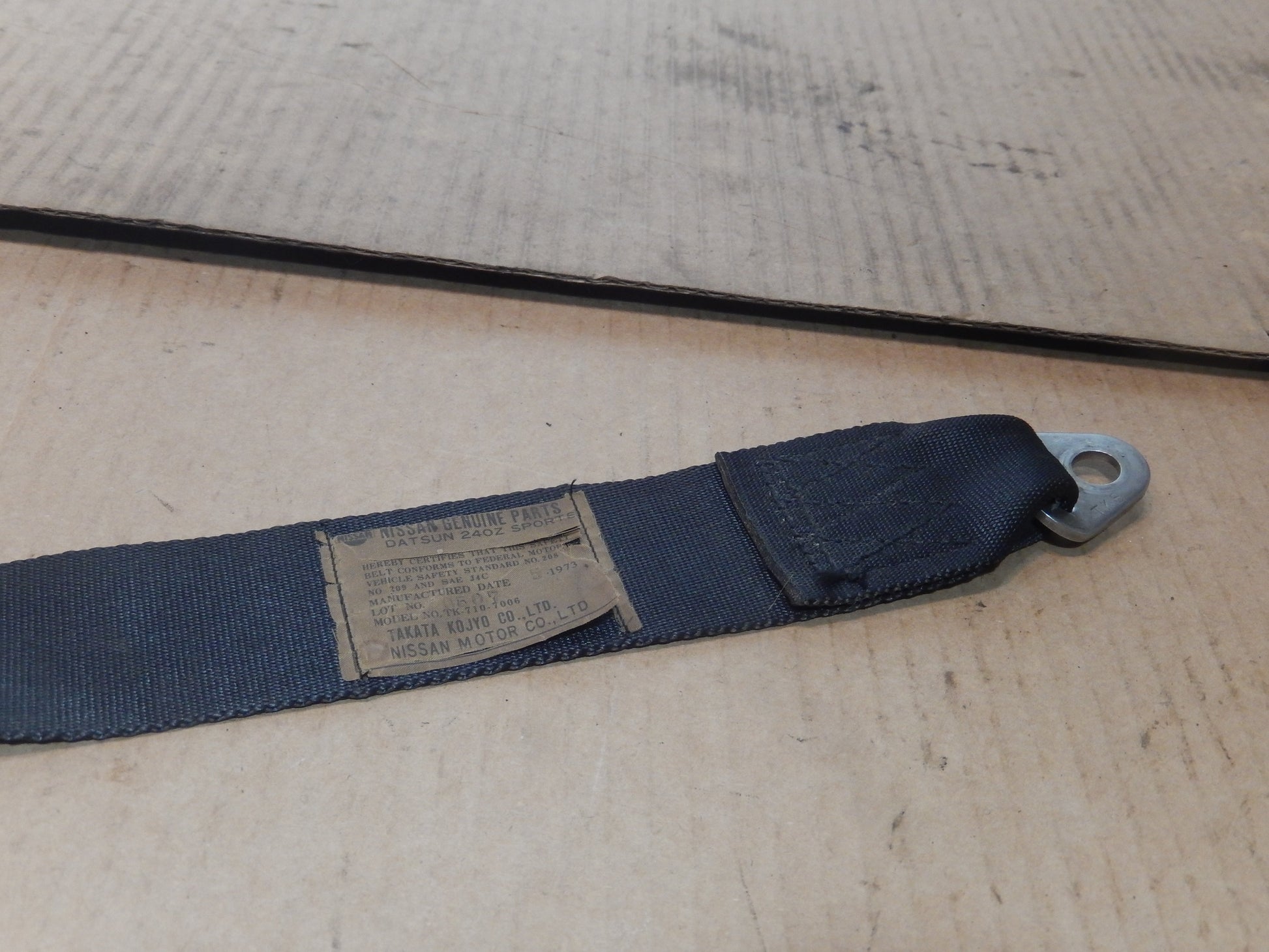 Datsun 240Z Shoulder Belt measures at 52" including mount tab and buckle. Belt in excellent condition - re-sewn at one end. Belt loop, buckle and mount tab are all perfect - in brilliant condition. With original label; label is fragile. Guaranteed.