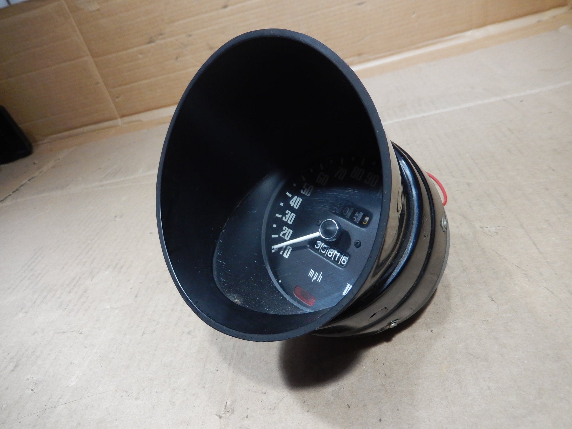 1973 Datsun 240Z Speedometer in Very Clean Condition. Great Dial Face and Dial. No damages or problems. We did a light clean up on the back case. Reset Works Perfectly. Guaranteed. SKU# 686.