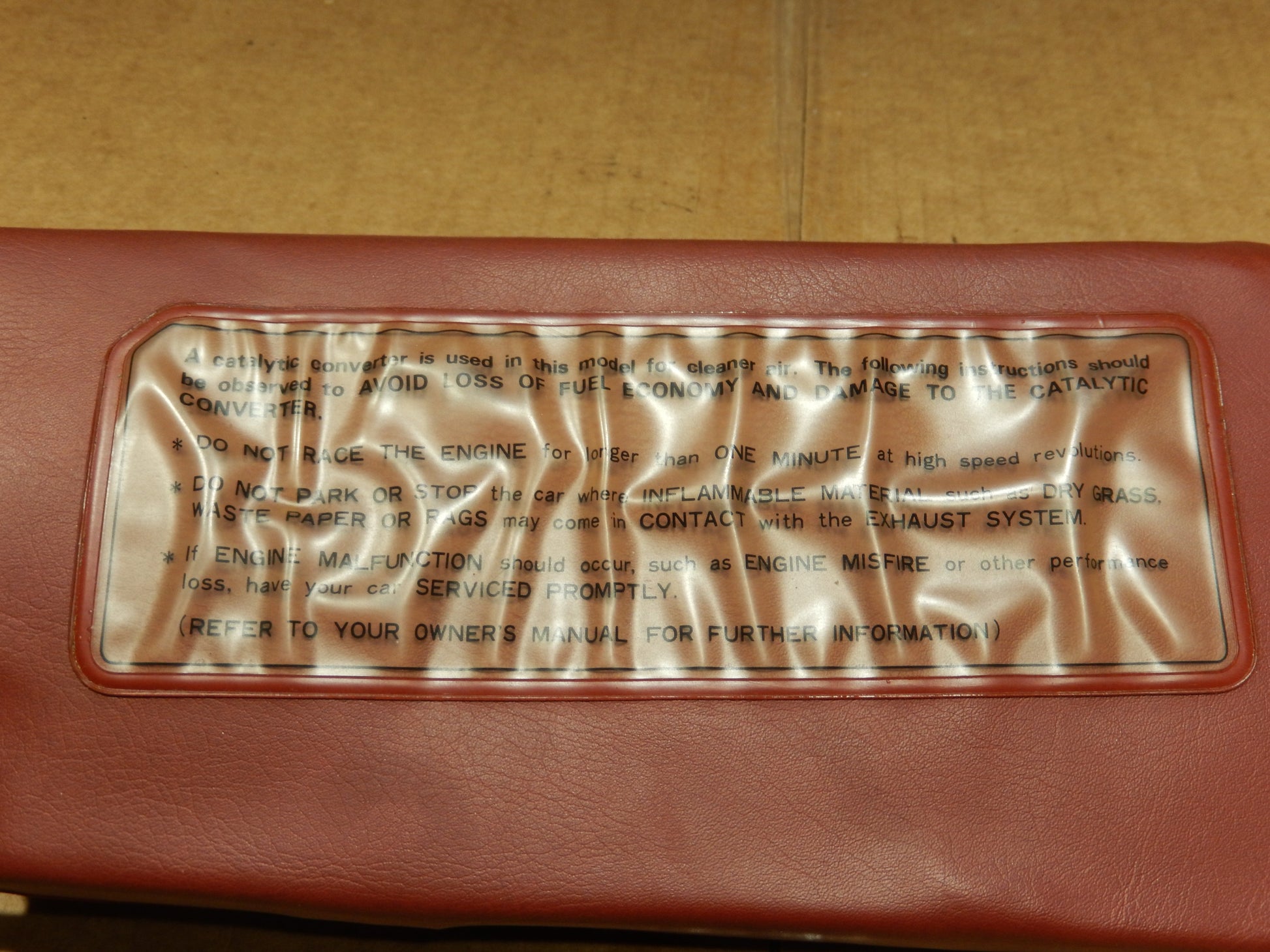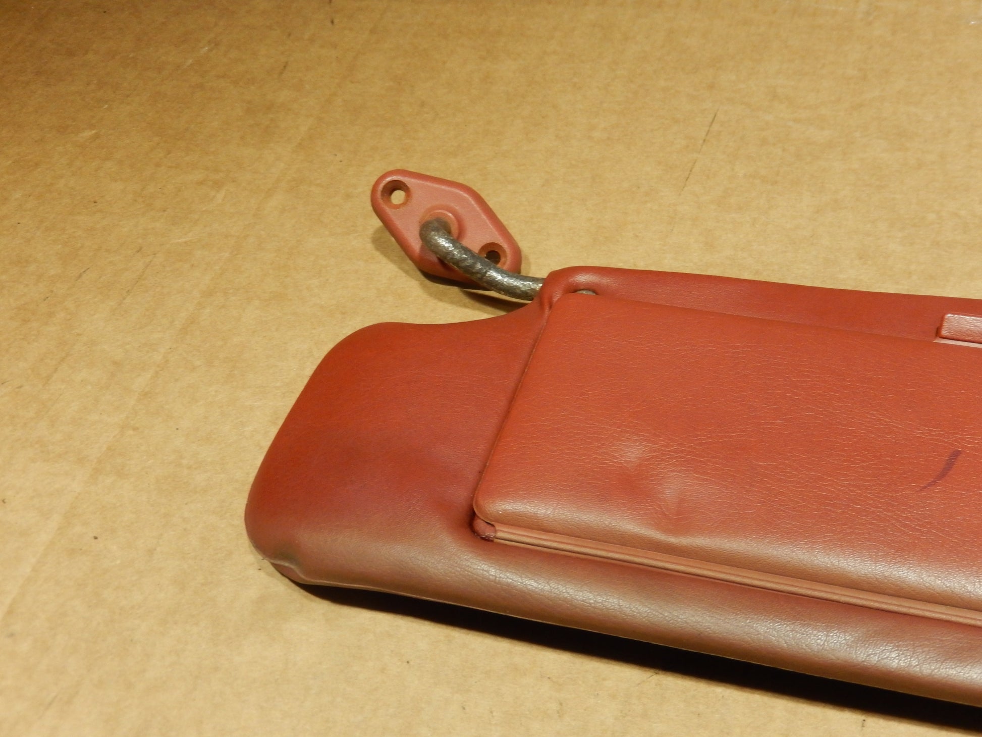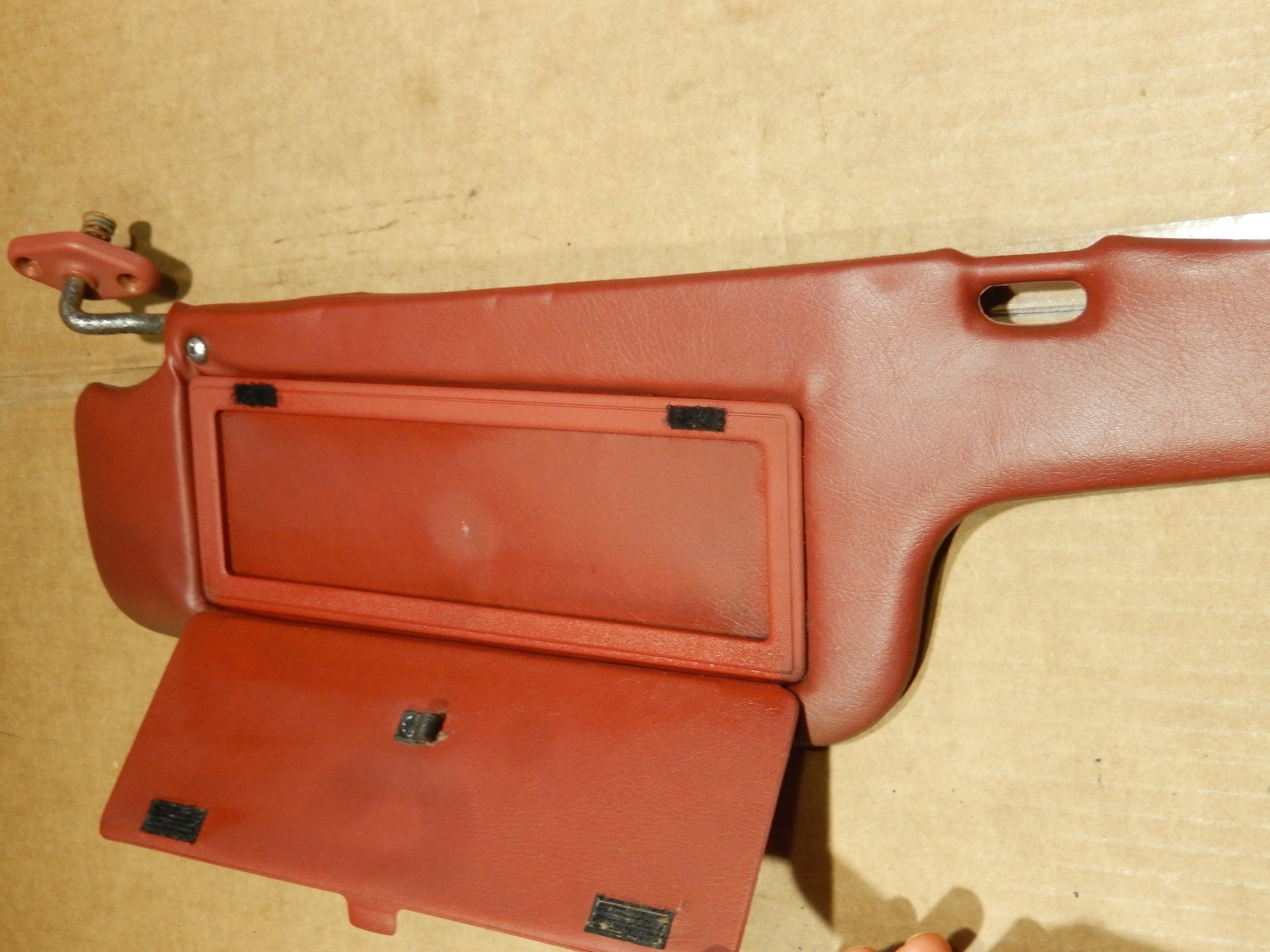 Datsun 280ZX Driver Side Sun Visor in Overall Very Good Condition with some minor imperfections. Vibrant red color. Has full safety engine and catalytic converter use script panel intact and readable. No mirror, but mirror frame intact as well as hinges and catch - fully intact. Two minor stains on visor flip lid. Hinge bar has some chrome loss and rough surface but has been cleaned off. Mounting plate is perfect. Overall, a very nice visor, with good hinge bar tension. Guaranteed.
