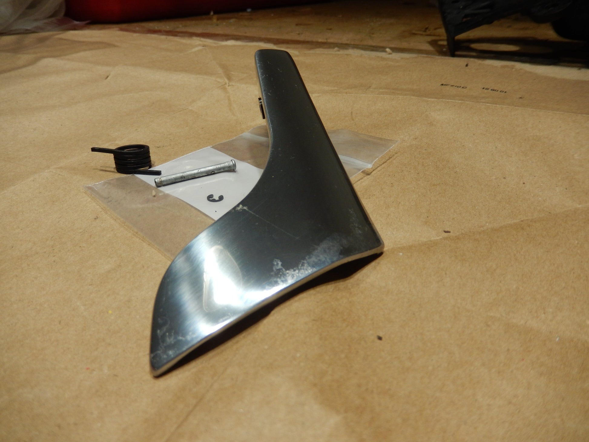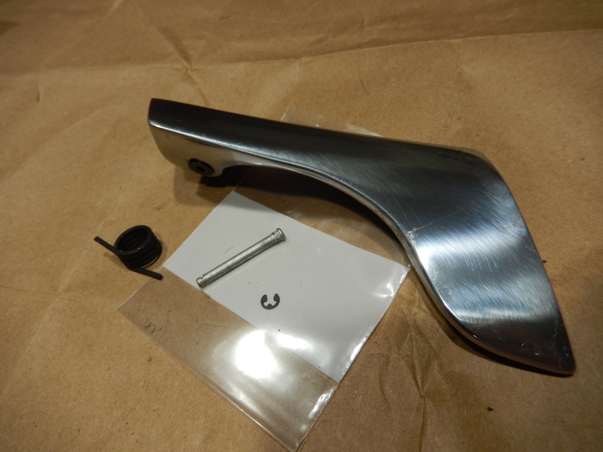 Maserati M139 Drivers Interior Door Latch Handle, with the Hinge Pin, Spring and ring clip in Perfect / Used Condition. This is a Clean Door Latch Handle in Very Good Condition. Some Clear Coat Loss. SKU # 640