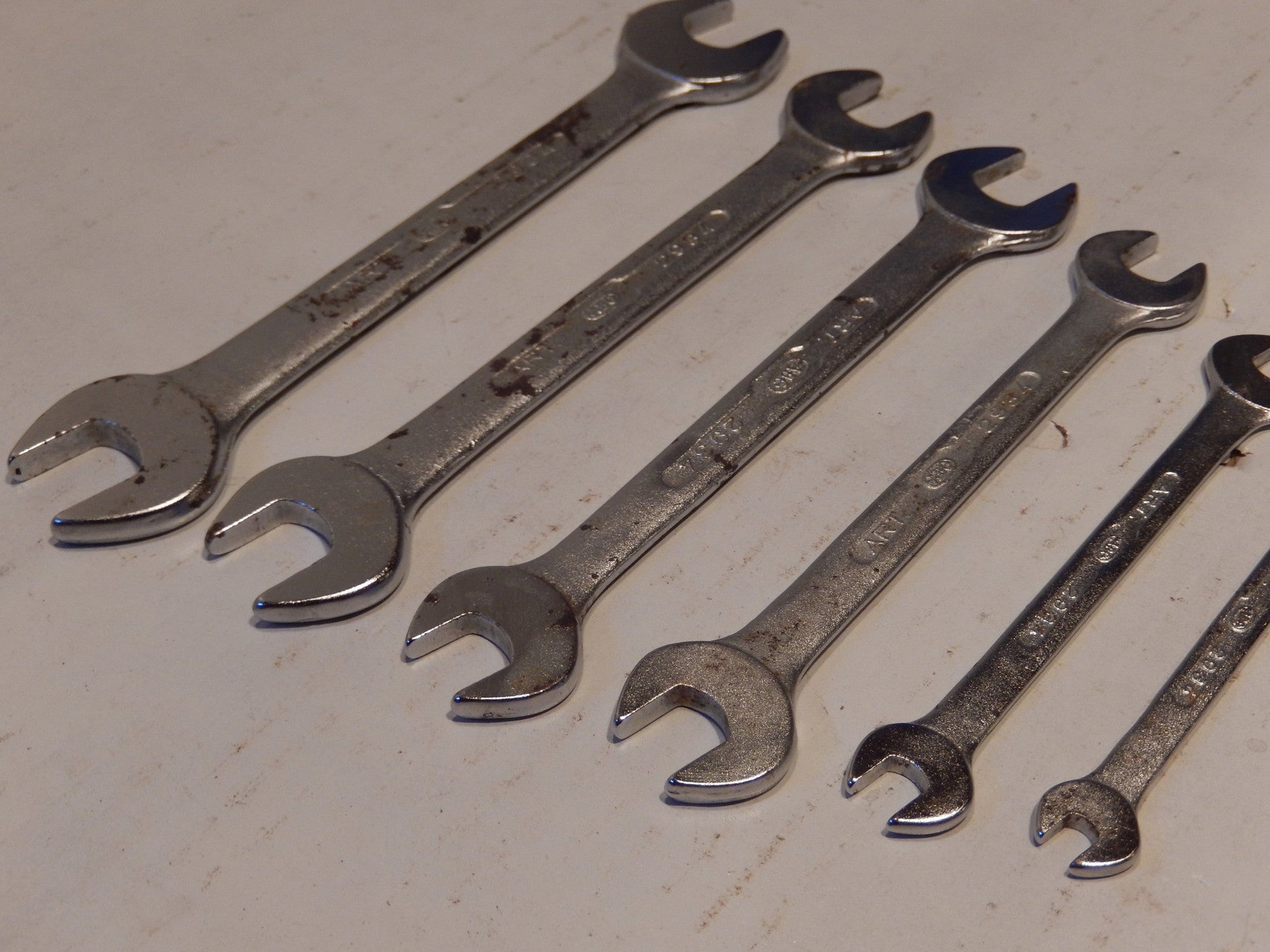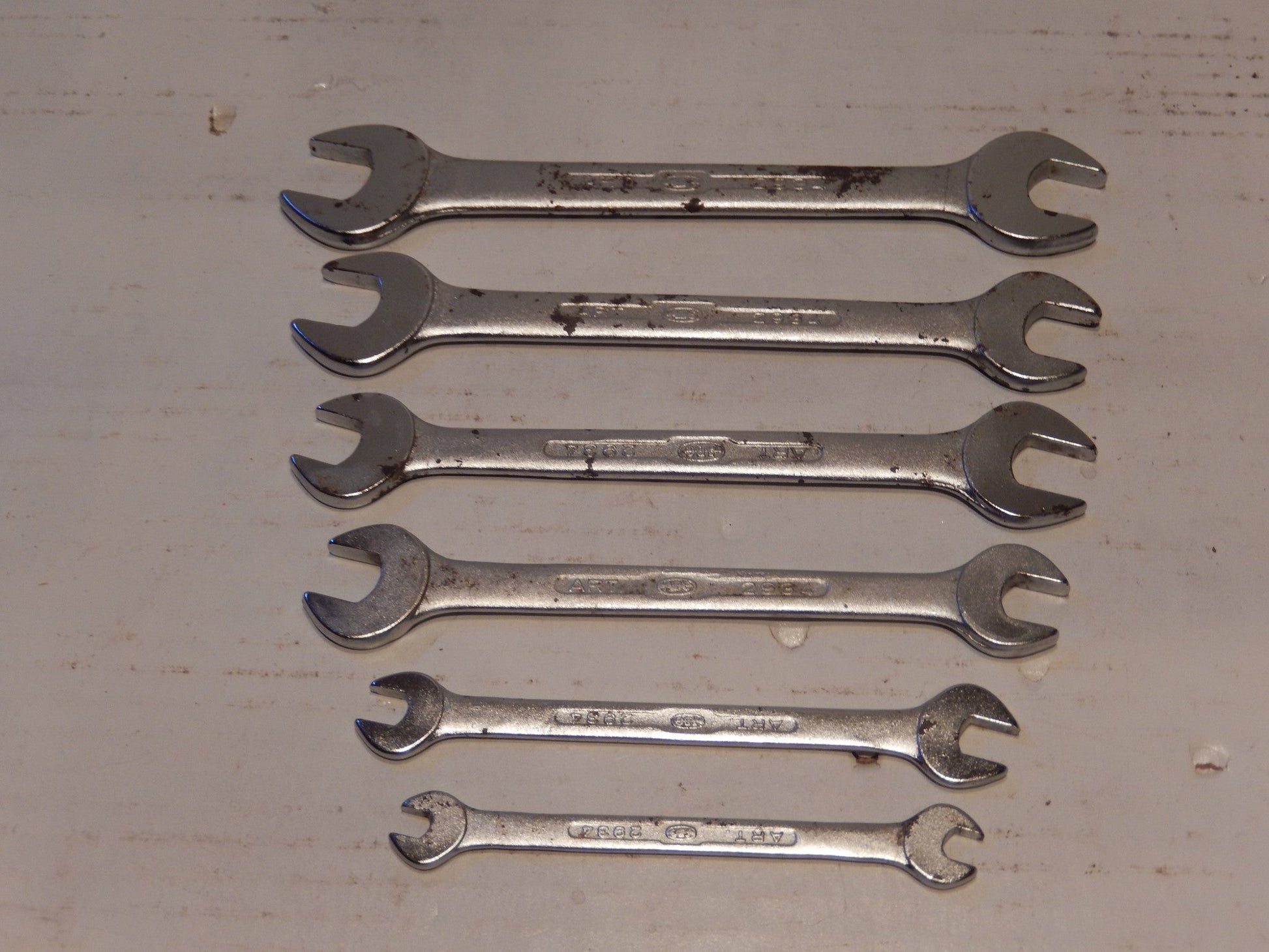6 Wrenches , 19 MM through 12 MM , 9 MM through 6 MM. They are in bright , very solid condition , crisp edges with some small areas of finish loss. These are very rare wrenches and nearly impossible to find.